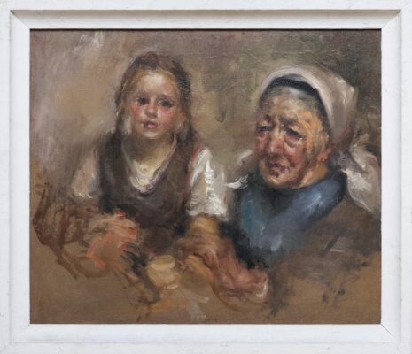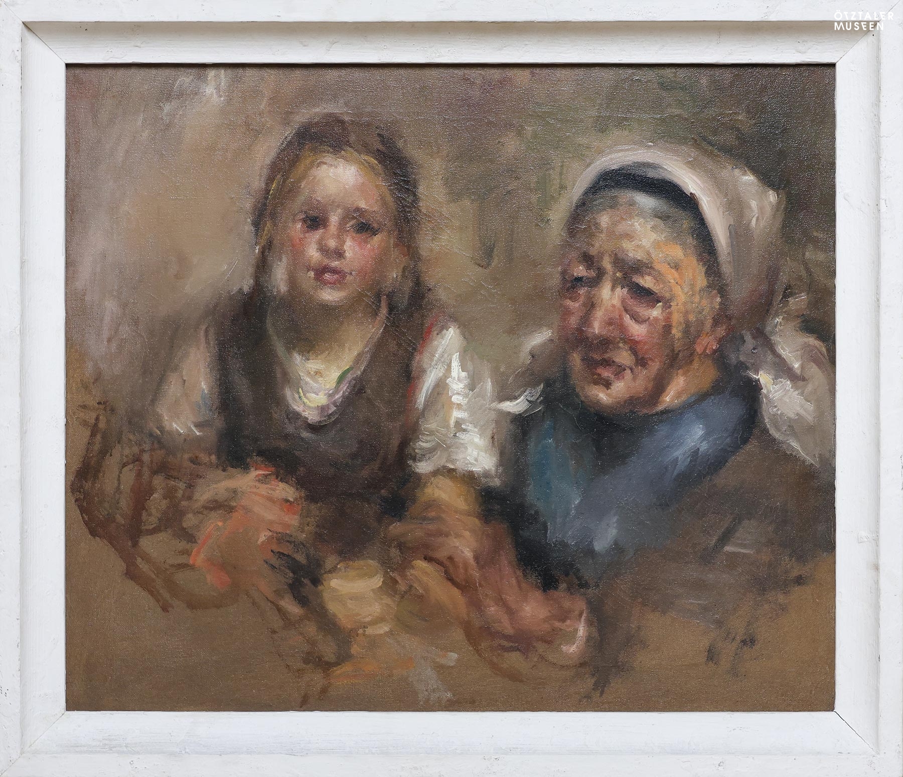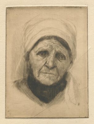 Eine alte Bäuerin blickt in diesem sehr detailliert ausgearbeiteten Bildnis mit einem sehr deutlich traurigen Blick auf die Betrachtenden.