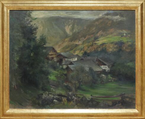 Blick von unten auf das Dorf. Der Fokus liegt auf den sonnenbeleuchteten Hügeln oberhalb der Ortschaft, wo auch das Malerhäusl errichtet wurde.