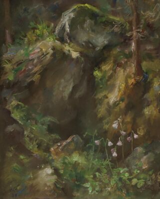 Hans Popp wagt es hier, die Landschaft deutlich abstrakter als sonst darzustellen, wodurch diese kaum einem speziellen Ort zugeordnet werden kann.