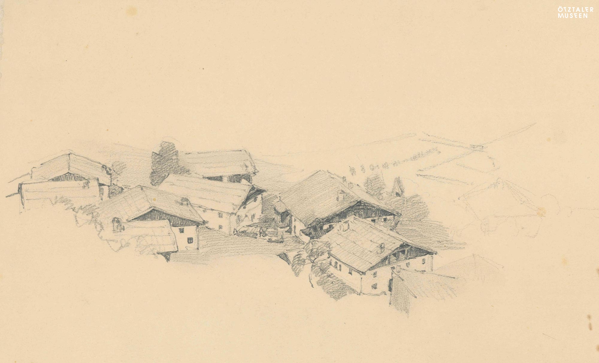 Zeichnung der alten Bauernhäuser von Piburg, Ansicht von oben in der Nähe des Malerhäusls.