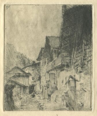 In dieser Radierung wird ein typischer alter Oberländer Straßenzug nur skizzenhaft und mit eher großen Linien dargestellt.