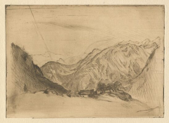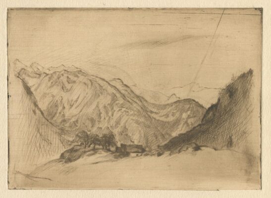 Auf dieser Druckgraphik ist die Landschaft nicht erkennbar. Da bei Radierungen das gestochene Motiv spiegelverkehrt wiedergegeben wird, ist davon auszugehen, dass der Künstler die Landschaft versehentlich nicht gespiegelt, sondern realitätsgetreu radiert hat.