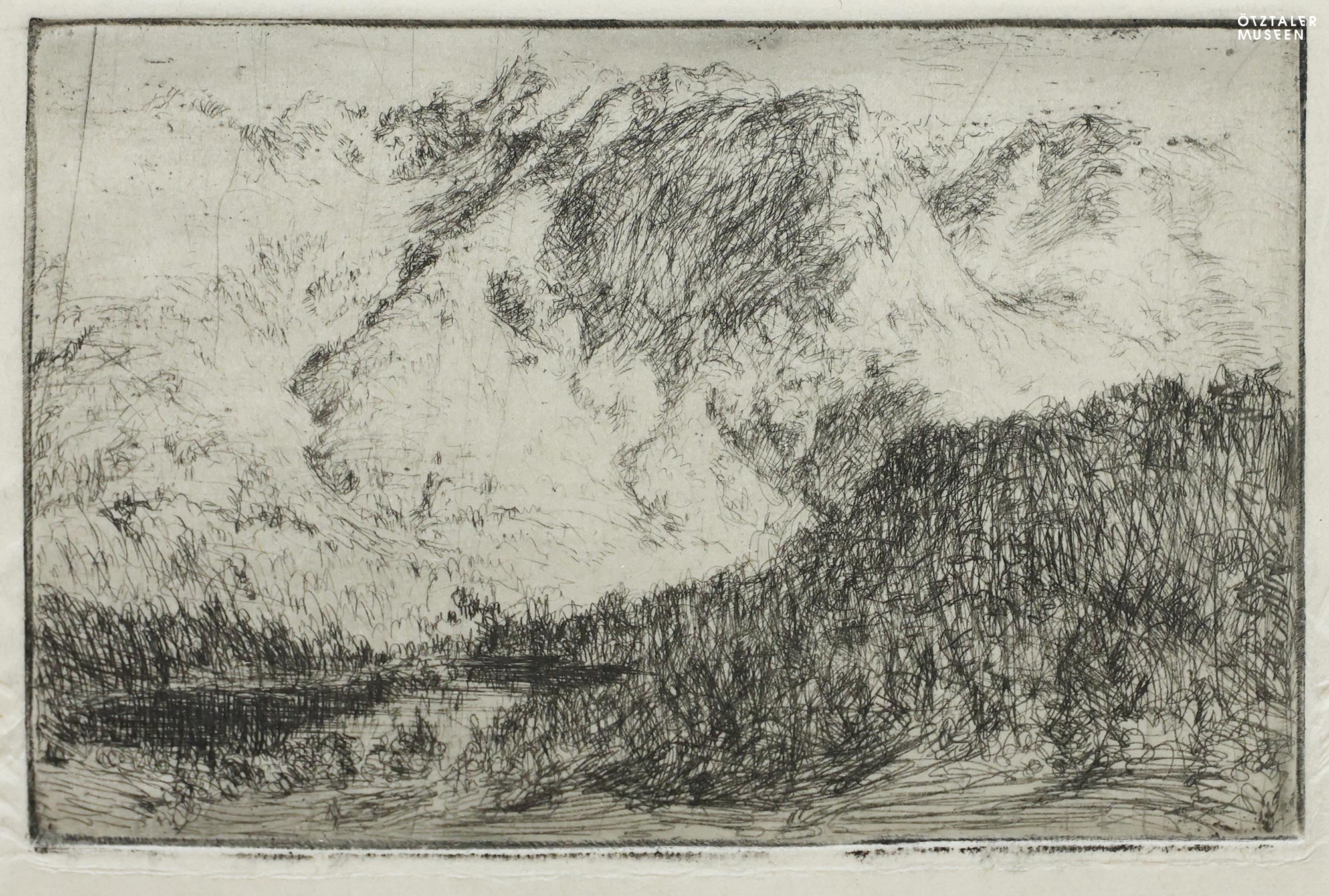 Mit relativ wilden großen Linien stellt der Künstler gekonnt eine Ansicht des Piburger Sees mit dem Acherkogel dar.