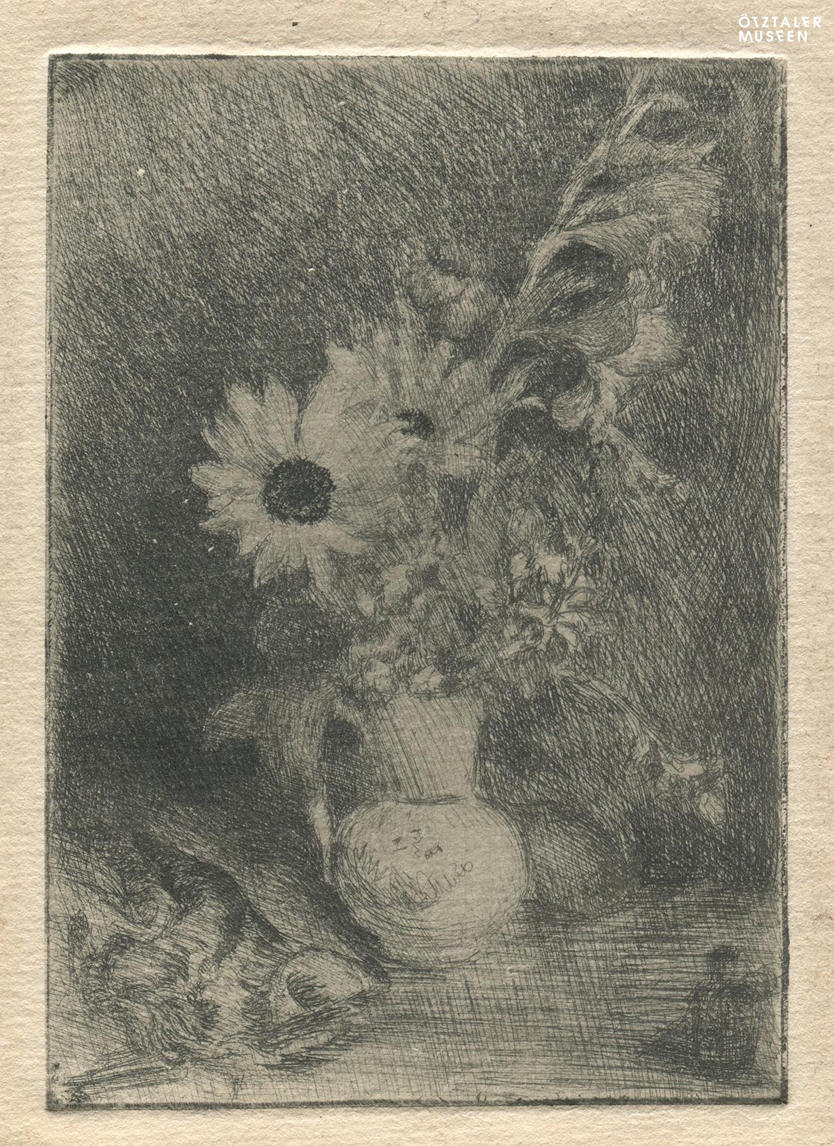 Eine äußerst Detaillierte Radierung ist dieses Stillleben mit Sonnenblumen in einer Vase.