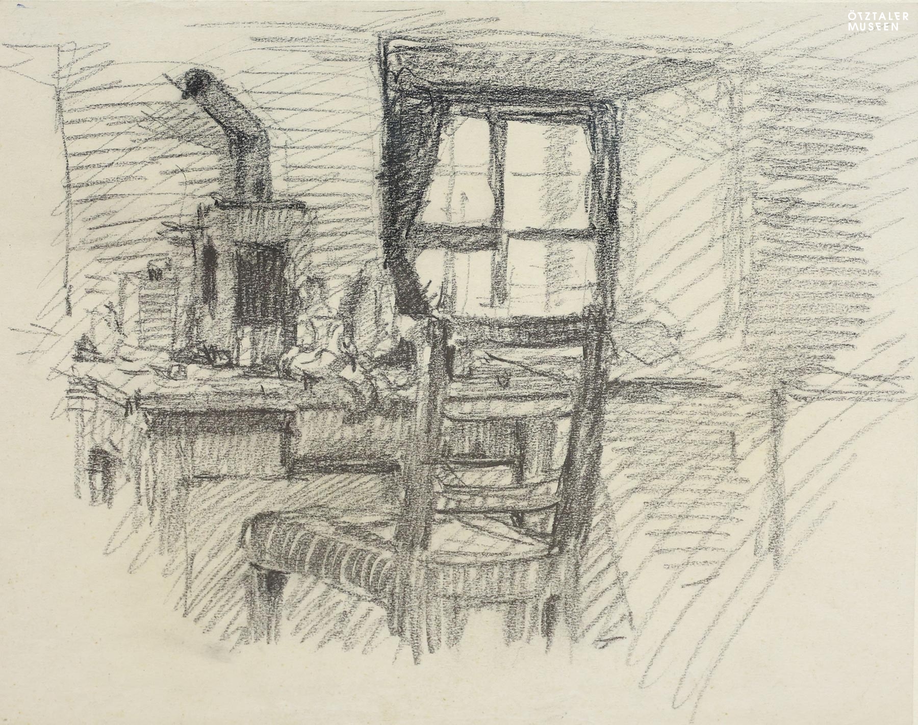 Schreibtisch am Fenster in einem alten Bauernhaus. Der skizzenhafte Charakter erschwert das Erkennen der Gegenstände am Tisch, und somit der genauen Funktion desselben.