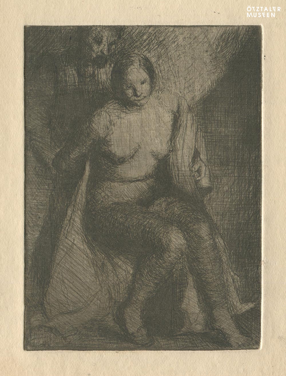 Ein sitzender, weiblicher Akt wird dargestellt. Im Hintergrund erscheint eine männliche Figur aus dem Schatten.