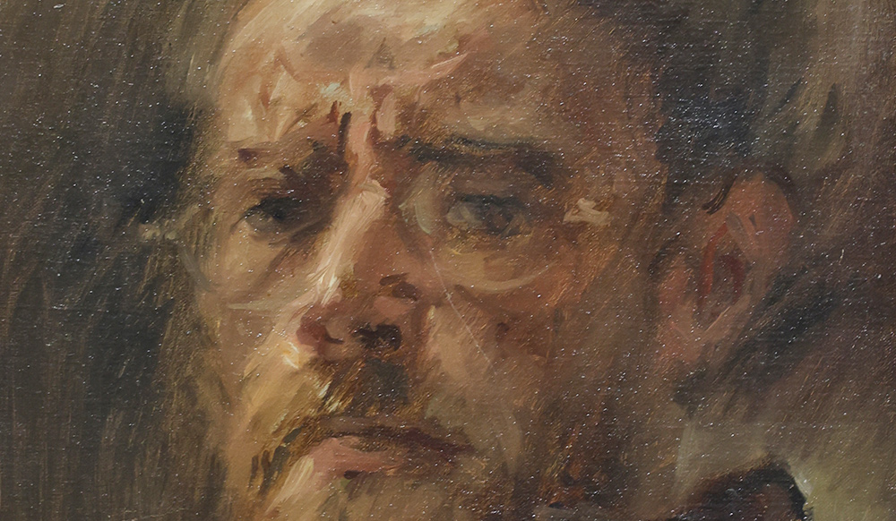 Die tiefen Schatten im Gesicht des Künstlers verstärken hier seinen strengen Blick, der frontal auf die Betrachtenden fällt.